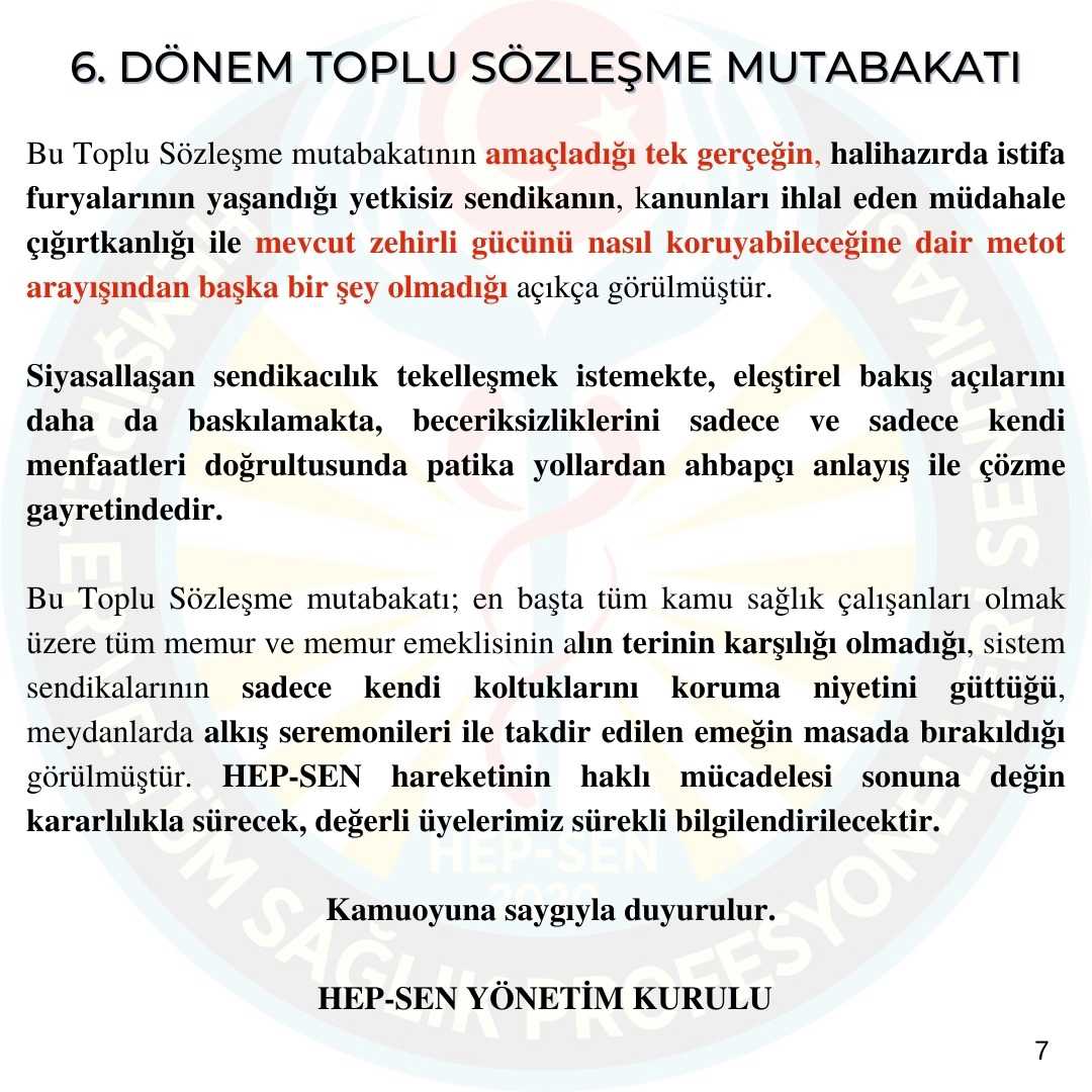 Bu Toplu Sözleşme mutabakatı; en başta tüm kamu sağlık çalışanları olmak üzere tüm memur ve memur emeklisinin alın terinin karşılığı olmadığı, sistem sendikalarının sadece kendi koltuklarını koruma niyetini güttüğü, meydanlarda alkış seremonileri ile takdir edilen emeğin masada bırakıldığı görülmüştür. HEP-SEN hareketinin haklı mücadelesi sonuna değin kararlılıkla sürecek, değerli üyelerimiz sürekli bilgilendirilecektir.