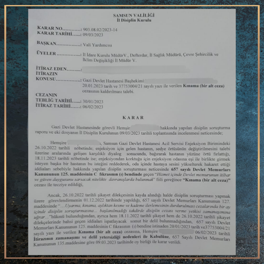 Samsun Gazi Devlet Hastanesi’nde hizmet veren Hep-Sen üyemize hastane idaresi tarafından verilen ceza, sendikamız hukuk biriminin Valiliğe sunduğu itiraz dilekçeleri ile iptal olmuştur.