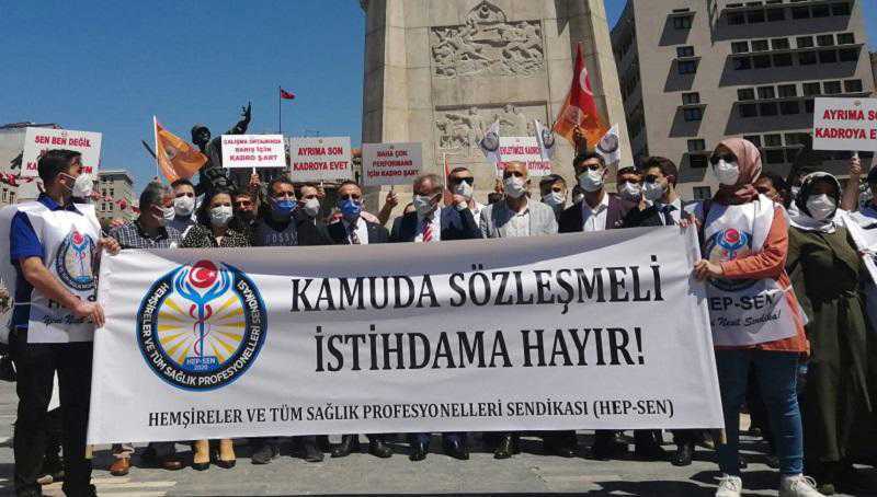 Hemşireler ve Tüm Sağlık Profesyonelleri Sendikası (HEP-SEN), Kamu Süresiz Sözleşmeli Memurlar Derneği ve Kamu Çalışanları Hak Sendikaları Konfederasyonu (HAK-SEN) sağlıkta kamuda sözleşmeli çalışma karşı güvenceli çalışma talebiyle eylem yaptı. HEP-SEN Genel Başkanı Yunus Şimşek, “Çalışma hayatı, kamuda süreli, süresiz sözleşmeler ile paramparça olmuştur. Sağlıkta güvencesiz istihdam ve adaletsiz ödeme sistemine ‘hayır’ diyoruz” dedi.