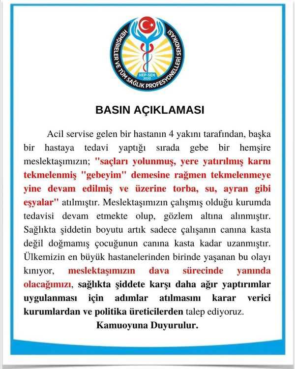Acil servise gelen bir hastanın 4 yakını tarafından, başka bir hastaya tedavi yaptığı sırada gebe bir hemşire meslektaşımızın; "Saçları yolunmuş, yere yatırılmış karnı tekmelenmiş "gebeyim" demesine rağmen tekmelenmeye yine devam edilmiş ve üzerine torba, su, ayran gibi eşyalar atılmıştır."