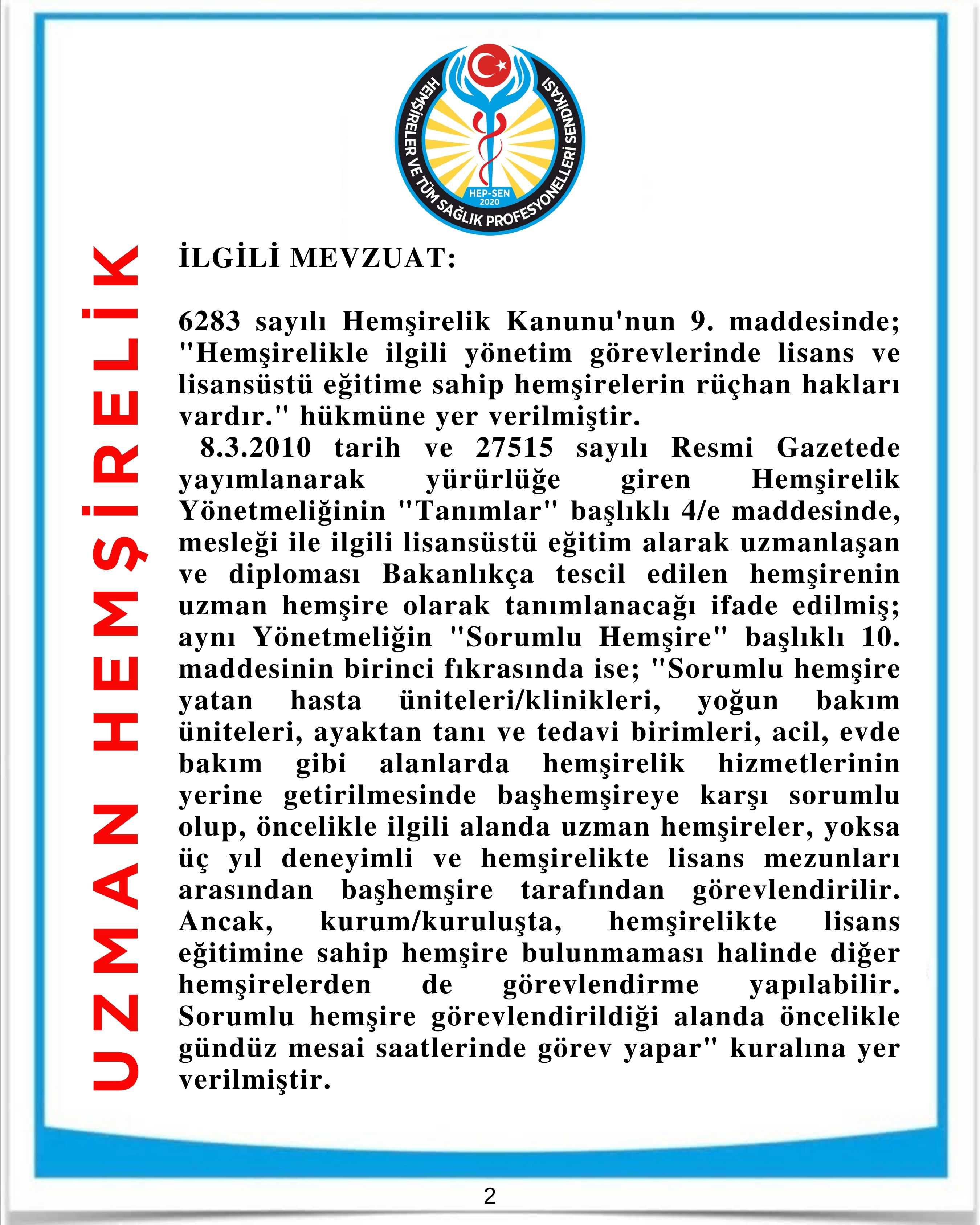 8.3.2010 tarih ve 27515 sayılı Resmi Gazetede yayımlanarak yürürlüğe giren Hemşirelik Yönetmeliğinin "Tanımlar" başlıklı 4/e maddesinde, mesleği ile ilgili lisansüstü eğitim alarak uzmanlaşan ve diploması Bakanlıkça tescil edilen hemşirenin uzman hemşire olarak tanımlanacağı ifade edilmiş; aynı Yönetmeliğin "Sorumlu Hemşire" başlıklı 10. maddesinin birinci fıkrasında ise; "Sorumlu hemşire yatan hasta üniteleri/klinikleri, yoğun bakım üniteleri, ayaktan tanı ve tedavi birimleri, acil, evde bakım gibi alanlarda hemşirelik hizmetlerinin yerine getirilmesinde başhemşireye karşı sorumlu olup, öncelikle ilgili alanda uzman hemşireler, yoksa üç yıl deneyimli ve hemşirelikte lisans mezunları arasından başhemşire tarafından görevlendirilir. Ancak, kurum/kuruluşta, hemşirelikte lisans eğitimine sahip hemşire bulunmaması halinde diğer hemşirelerden de görevlendirme yapılabilir. Sorumlu hemşire görevlendirildiği alanda öncelikle gündüz mesai saatlerinde görev yapar" kuralına yer verilmiştir.