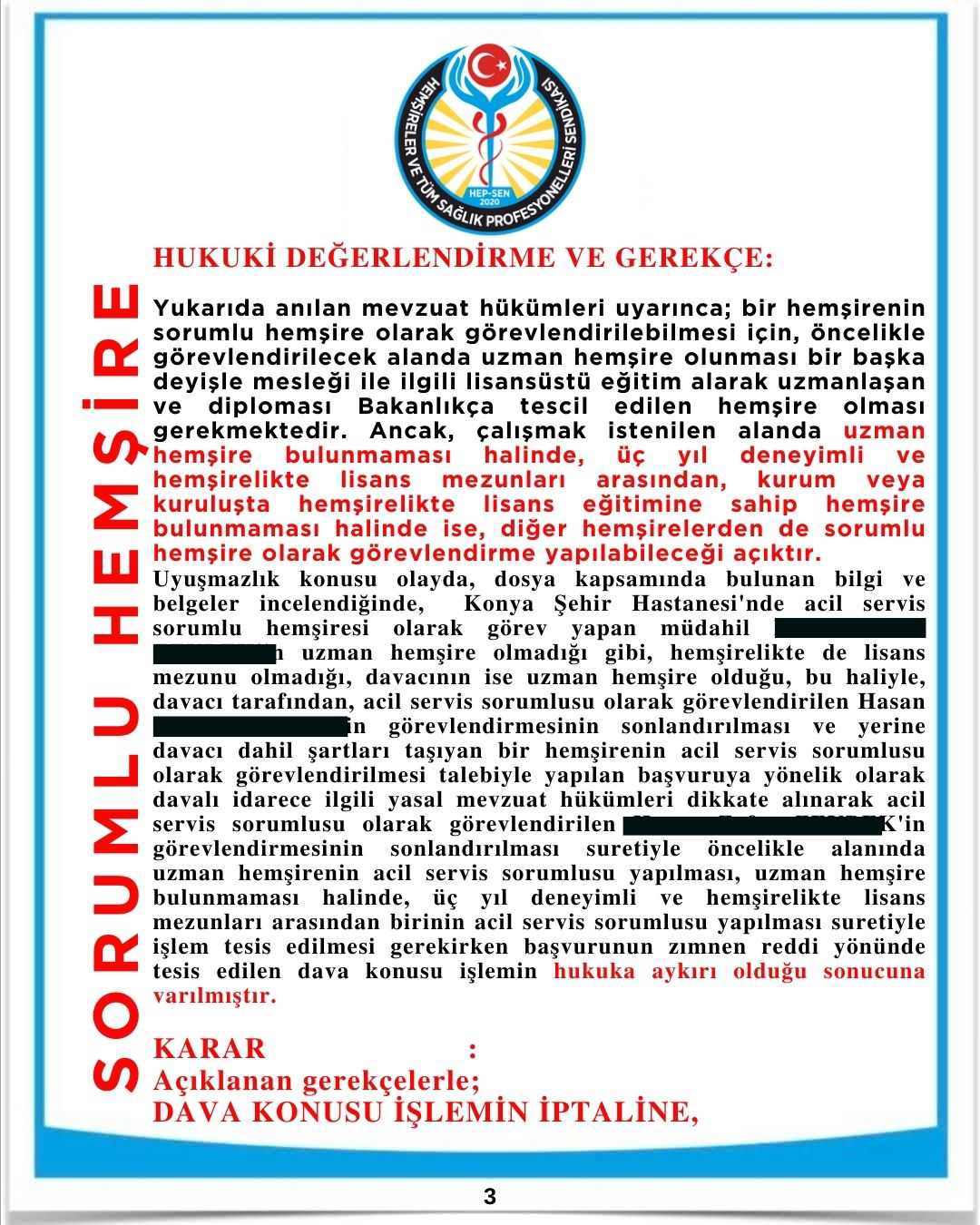 Hemşireler ve Tüm Sağlık Profesyonelleri Sendikası (HEP-SEN) tarafından 6283 sayılı Hemşirelik Kanunu'nun 9.maddesinde geçen "Rüçhan hakkı" kullanılarak Konya Şehir Hastanesi'ne açılan davada mahkeme, tokat niteliğinde karar vermiş; torpilli sendika ataması yöneticilik karşısında "Hemşirelik Kanunu" kazanmıştır.