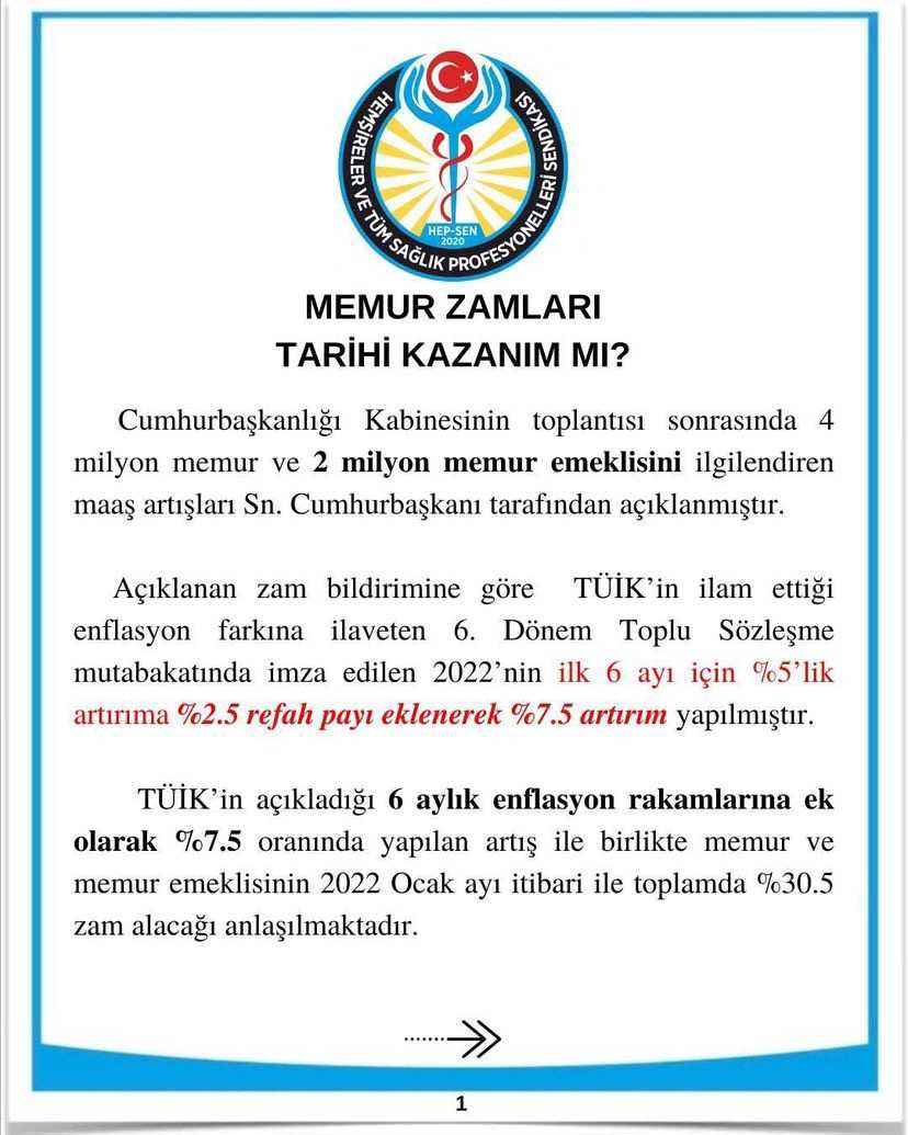 TÜİK’in açıkladığı 6 aylık enflasyon rakamlarına ek olarak %7.5 oranında yapılan artış ile birlikte memur ve memur emeklisinin 2022 Ocak ayı itibari ile toplamda %30.5 zam alacağı anlaşılmaktadır.
