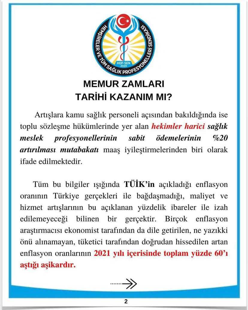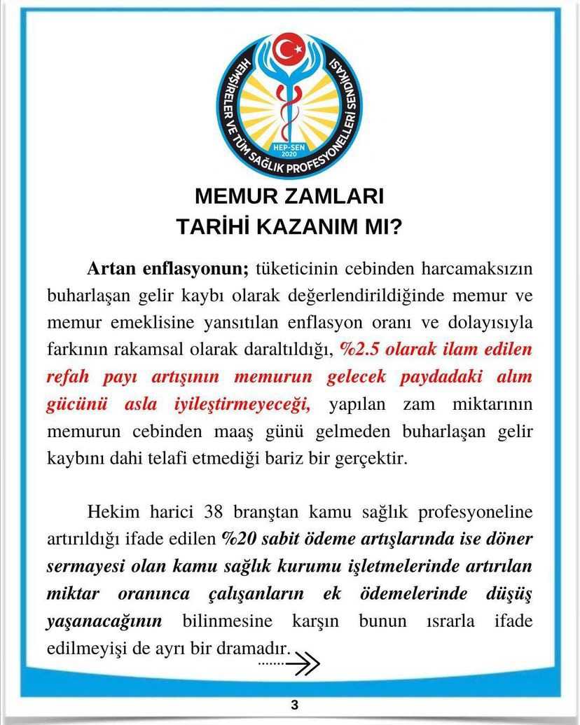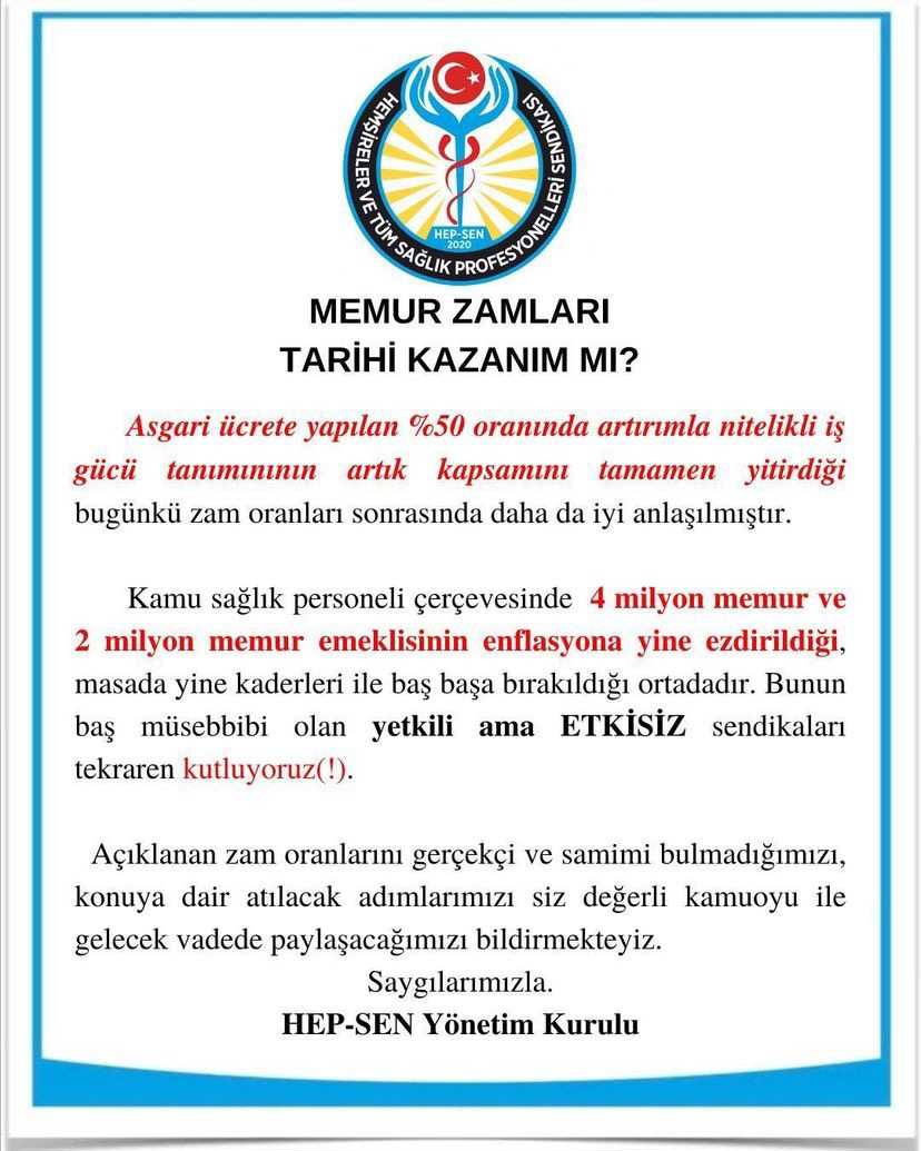 Kamu sağlık personeli çerçevesinde 4 milyon memur ve 2 milyon memur emeklisinin enflasyona yine ezdirildiği, masada yine kaderleri ile baş başa bırakıldığı ortadadır. Bunun baş müsebbibi olan etkisiz yetkili sendikaları tekraren kutluyoruz(!).