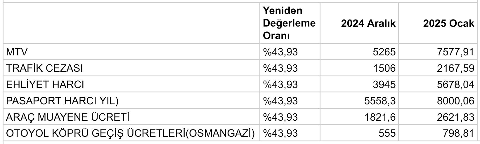 2024 Aralık ve 2025 Ocak ayları arasındaki çeşitli ücretlerde %43.93 oranındaki artışlar, vatandaşların bütçesini zorlamaktadır. MTV, trafik cezaları, ehliyet ve pasaport harçlarındaki bu yükselişler yaşam maliyetlerinde ciddi bir artışı beraberinde getirmiştir.