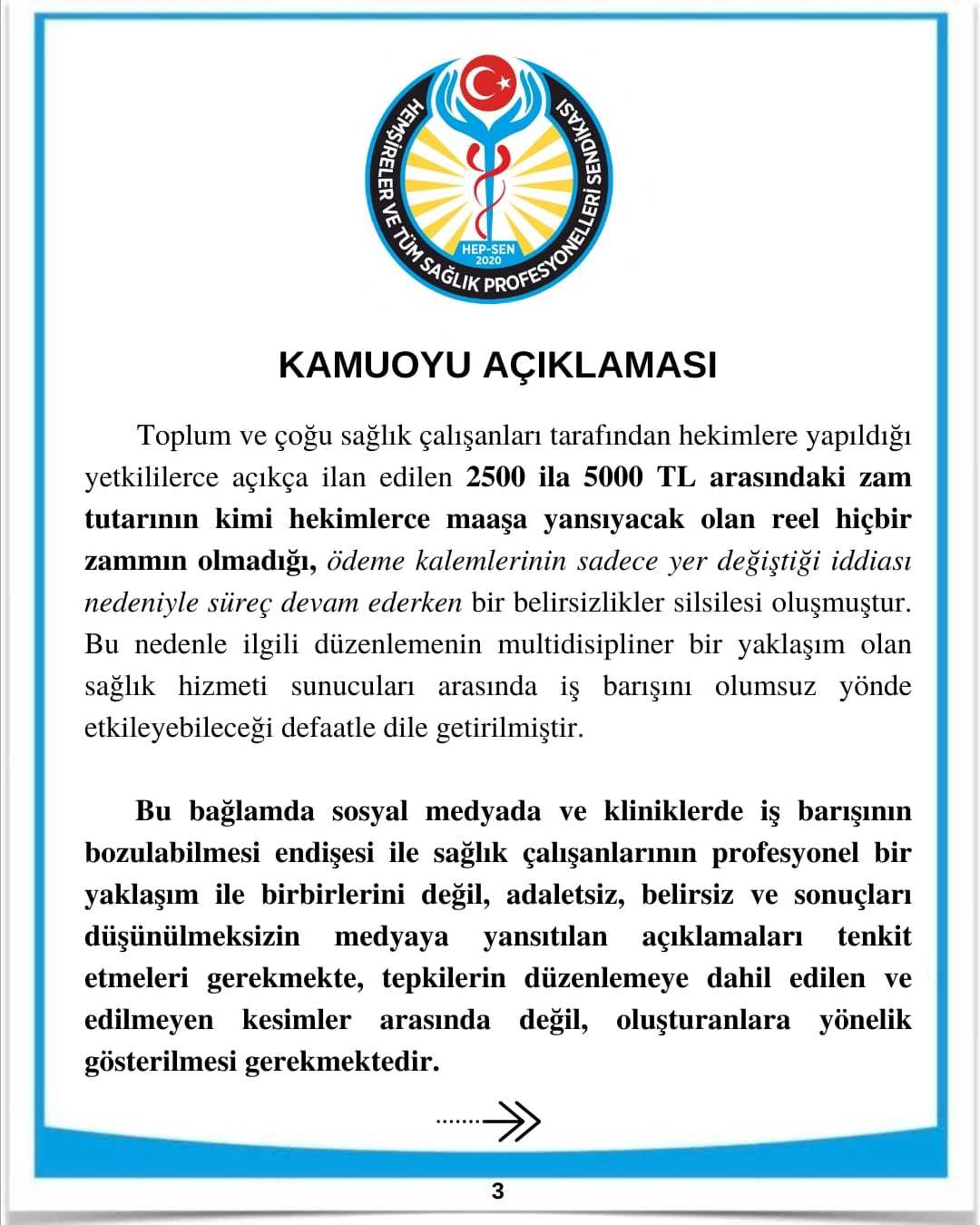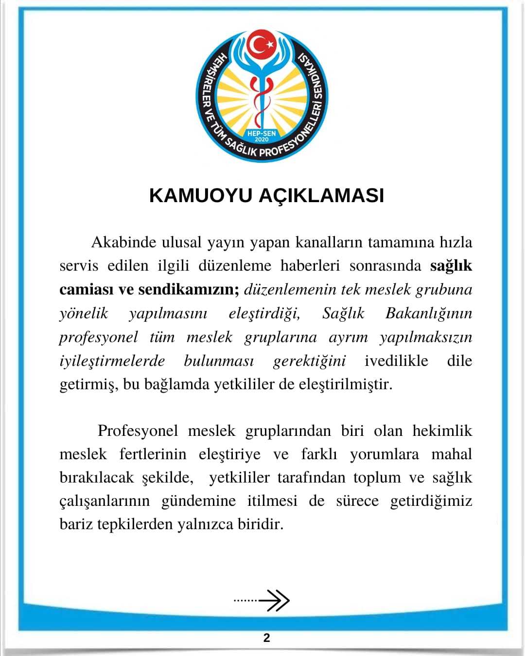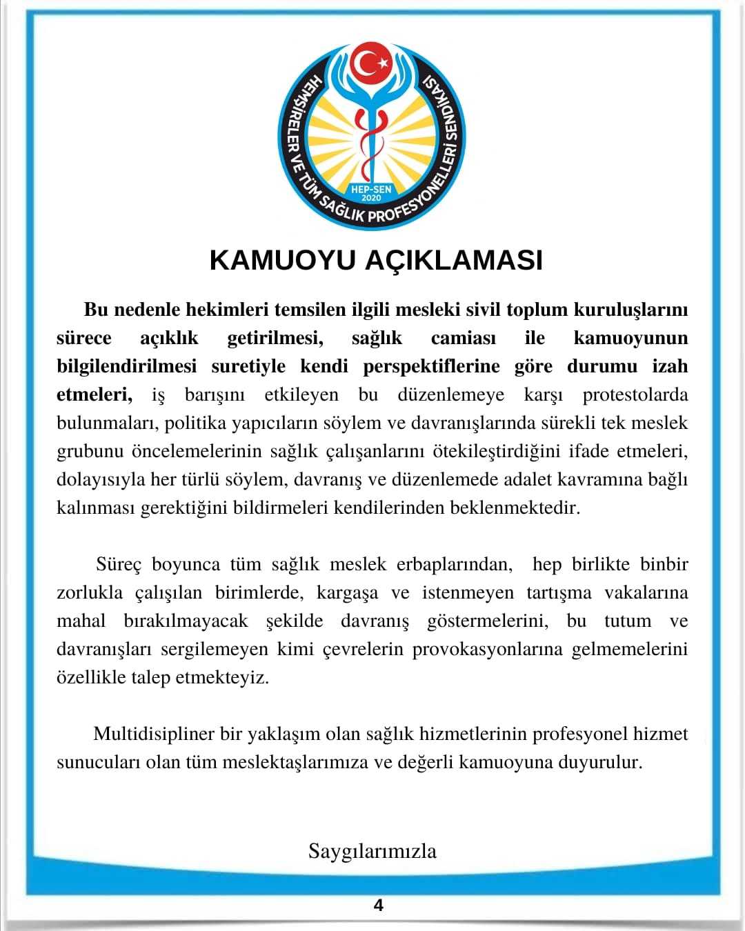 Bu nedenle hekimleri temsilen ilgili mesleki sivil toplum kuruluşlarını sürece açıklık getirilmesi, sağlık camiası ile kamuoyunun bilgilendirilmesi suretiyle kendi perspektiflerine göre durumu izah etmeleri, iş barışını etkileyen bu düzenlemeye karşı protestolarda bulunmaları, politika yapıcıların söylem ve davranışlarında sürekli tek meslek grubunu öncelemelerinin sağlık çalışanlarını ötekileştirdiğini ifade etmeleri, dolayısıyla her türlü söylem, davranış ve düzenlemede adalet kavramına bağlı kalınması gerektiğini bildirmeleri kendilerinden beklenmektedir.