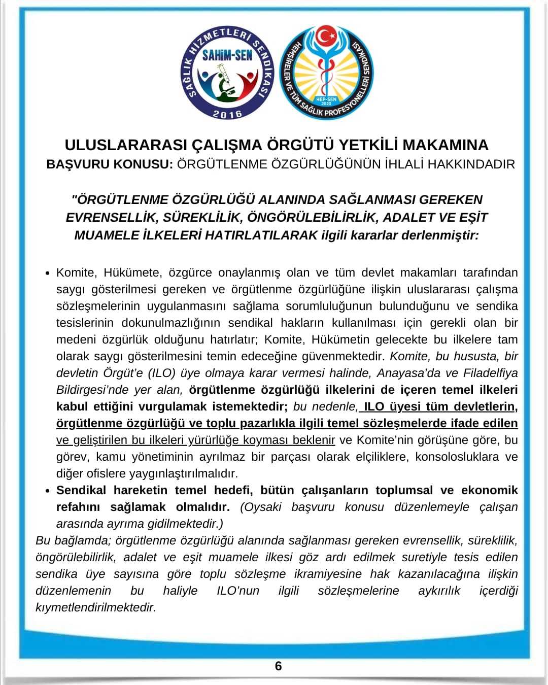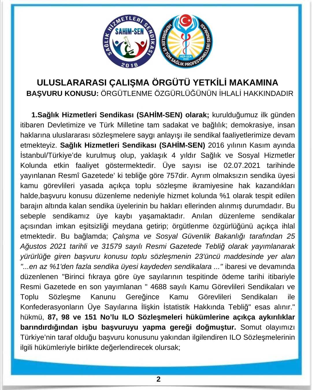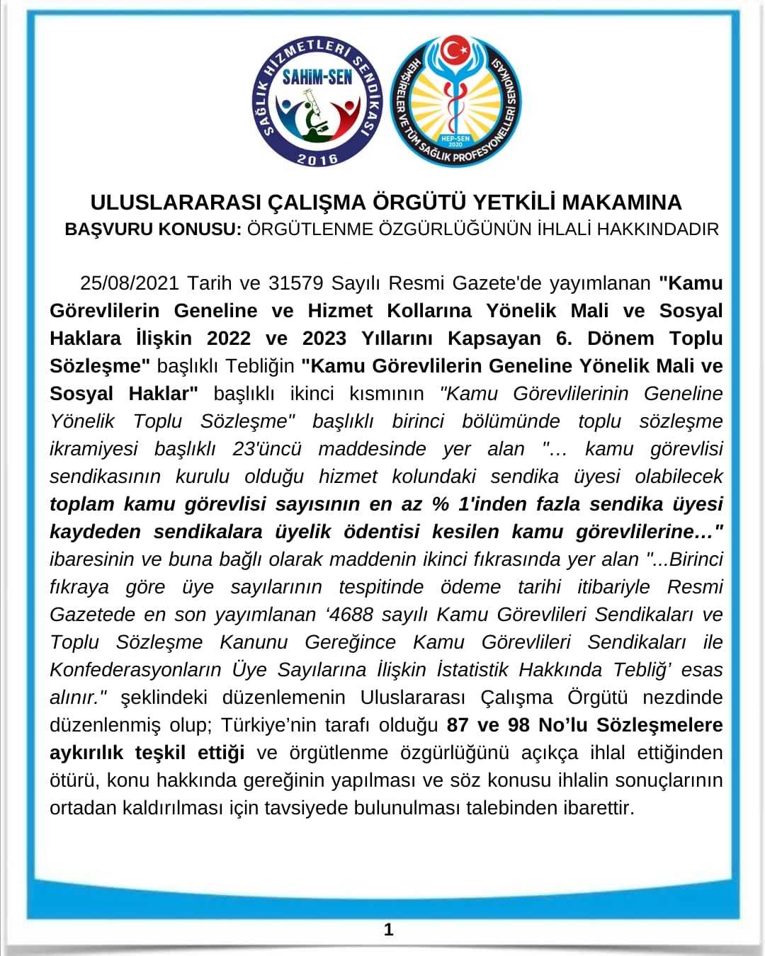 25/08/2021 Tarih ve 31579 Sayılı Resmi Gazete'de yayımlanan "Kamu Görevlilerin Geneline ve Hizmet Kollarına Yönelik Mali ve Sosyal Haklara İlişkin 2022 ve 2023 Yıllarını Kapsayan 6. Dönem Toplu Sözleşme" başlıklı Tebliğin "Kamu Görevlilerin Geneline Yönelik Mali ve Sosyal Haklar" başlıklı ikinci kısmının "Kamu Görevlilerinin Geneline Yönelik Toplu Sözleşme" başlıklı birinci bölümünde toplu sözleşme ikramiyesi başlıklı 23'üncü maddesinde yer alan "… kamu görevlisi sendikasının kurulu olduğu hizmet kolundaki sendika üyesi olabilecek toplam kamu görevlisi sayısının en az % 1'inden fazla sendika üyesi kaydeden sendikalara üyelik ödentisi kesilen kamu görevlilerine…"ibaresinin ve buna bağlı olarak maddenin ikinci fıkrasında yer alan "...Birinci fıkraya göre üye sayılarının tespitinde ödeme tarihi itibariyle Resmi Gazetede en son yayımlanan ‘4688 sayılı Kamu Görevlileri Sendikaları ve Toplu Sözleşme Kanunu Gereğince Kamu Görevlileri Sendikaları ile Konfederasyonların Üye Sayılarına İlişkin İstatistik Hakkında Tebliğ’ esas alınır." şeklindeki düzenlemenin Uluslararası Çalışma Örgütü nezdinde düzenlenmiş olup; Türkiye’nin tarafı olduğu 87 ve 98No’lu Sözleşmelere aykırılık teşkil ettiği ve örgütlenme özgürlüğünü açıkça ihlal ettiğinden ötürü, konu hakkında gereğinin yapılması ve söz konusu ihlalin sonuçlarının ortadan kaldırılması için tavsiyede bulunulması talebinden ibarettir.