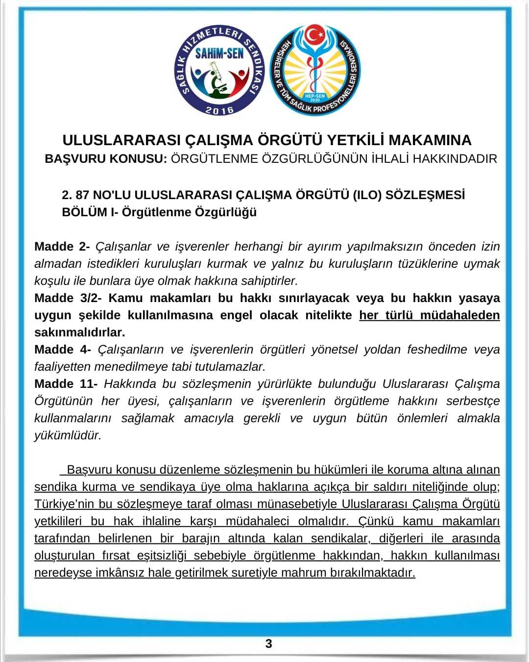 Başvurumuzun kabul edilerek; başvuru konusu toplu sözleşme hükümlerinin 87 ve 98 No’lu sözleşmelerle koruma altına alınan sendikal hakların ve örgütlenme özgürlüğünün ihlalini içerdiğini değerlendirdiğimizden, söz konusu hak ihlalinin ortadan kaldırılması adına ihlalin sonuçlarının ortadan kaldırılması için tavsiyede bulunulmasını saygılarımızla arz ve talep ederiz.