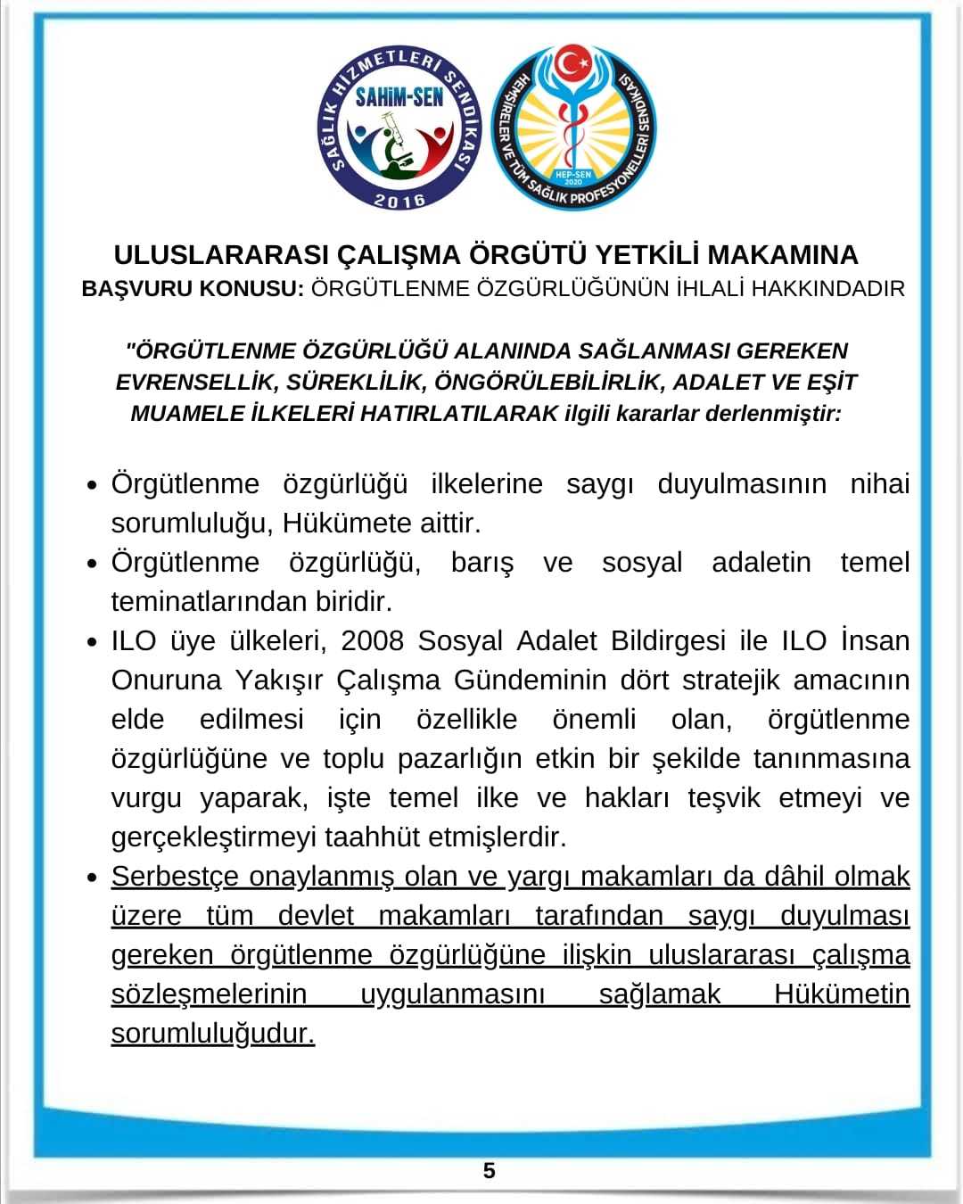 4.Ayrıca; “ILO Örgütlenme Özgürlüğü Komitesi Kararları Derlemesi” kitabında (Uluslararası Çalışma Bürosu- Cenevre: ILO, 6. baskı, 2019) "ÖRGÜTLENME ÖZGÜRLÜĞÜ ALANINDA SAĞLANMASI GEREKEN EVRENSELLİK, SÜREKLİLİK, ÖNGÖRÜLEBİLİRLİK, ADALET VE EŞİT MUAMELE İLKELERİ HATIRLATILARAK ilgili kararlar derlenmiştir: