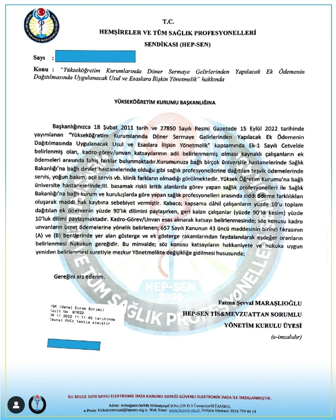 Sağlık Bakanlığı'na bağlı kurum ve kuruluşlarda çalışan tüm sağlık profesyonelleri ile Yükseköğretim Kurumlarına bağlı kurum ve kuruluşlarda çalışan tüm sağlık profesyonelleri arasında ciddi ödeme farklılıkları ve hak kayıpları olduğuna dikkat çekerek mezkur yönetmelikte değişikliğe gidilmesi hususunda sendika adına Yükseköğretim Kurumuna yazılı dilekçe başvurusunda bulunmuştur.
