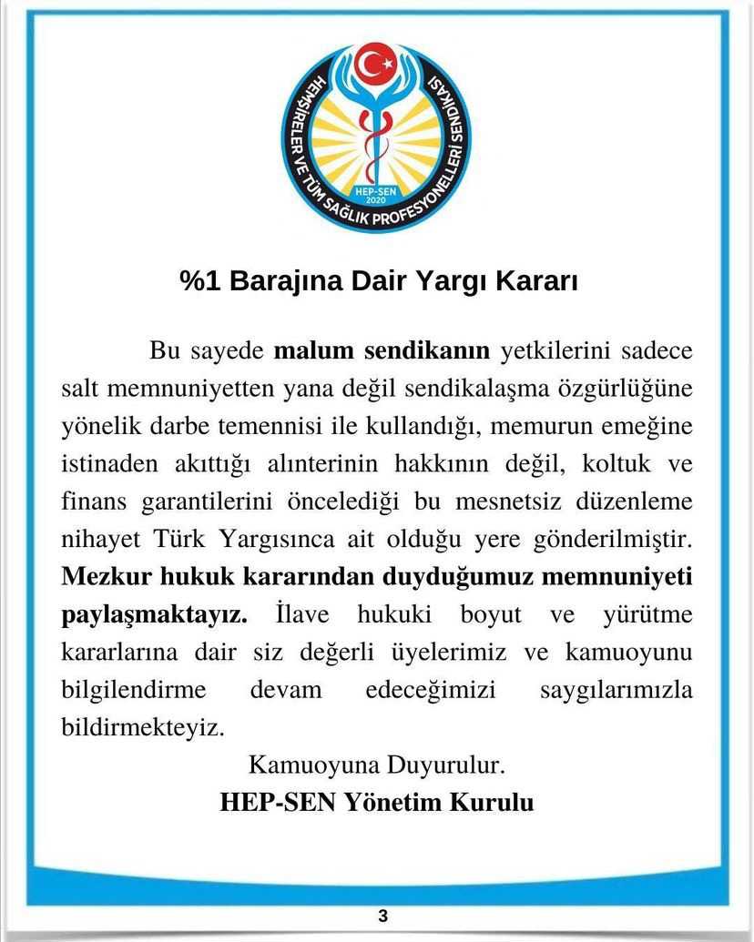 Bu sayede malum sendikanın yetkilerini sadece salt memnuniyetten yana değil sendikalaşma özgürlüğüne yönelik darbe temennisi ile kullandığı, memurun emeğine istinaden akıttığı alınterinin hakkının değil, koltuk ve finans garantilerini öncelediği bu mesnetsiz düzenleme nihayet Türk Yargısınca ait olduğu yere gönderilmiştir. Mezkur hukuk kararından duyduğumuz memnuniyeti paylaşmaktayız. İlave hukuki boyut ve yürütme kararlarına dair siz değerli üyelerimiz ve kamuoyunu bilgilendirme devam edeceğimizi saygılarımızla bildirmekteyiz.