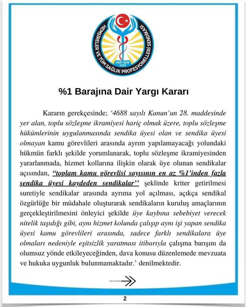 Etkisiz yetkili malum sendikanın, 6. Dönem Toplu Sözleşme görüşmelerinde Çalışma ve Sosyal Güvenlik Bakanlığı ile imza altına aldığı, deyim yerindeyse Türk sendikacılığının demokratik ve eşitlikçi normlarına darbe yapılmaya yeltenildiği %1’lik Sendikalaşma Barajına yönelik sendikamız gerekli iptal davalarını ilgili kanun tasarısı sonrasında açacağından mezkur yasa tasarısını beklemekte iken, öncesinde yine sendikamızın da haklı hukuk mücadelesinde destek verdiği onca sendikadan yalnızca biri olan Diyanet ve Vakıf Görevlileri Sendikasının, Çalışma ve Sosyal Güvenlik Bakanlığına yönelik açtığı yürütmenin durdurulması istemli davada, yargılamayı yapan Danıştay 12. Dairesi 2021/6348 sayılı esas numarası ile mezkur %1 lik Sendikalaşma Barajına dair Yürütmenin Durdurulması Kararını vermiştir.